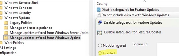 There is a Group Policy option Disable safeguard for Feature Updates that allows you to remove the block on delivering new Windows 11 builds caused by safeguard holds due to compatibility issues (under Computer Configuration -> Administrative Templates -> Windows Components -> Windows Update -> Manage update offered from Windows Update). If the policy is Enabled, it allows new Feature Updates to be delivered and installed through Windows Update despite an active safeguard hold.