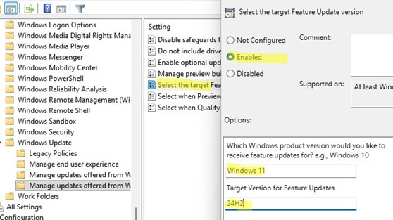 Windows 11in Which Windows product version would you like to receive feature updates for; - Set a target Windows 11 build number in Target Version for Feature Updates. For example,
