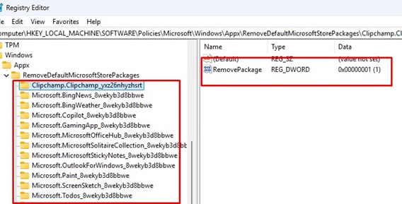 After enabling this policy, the HKLM\SOFTWARE\Policies\Microsoft\Windows\Appx\RemoveDefaultMicrosoftStorePackages key is created in the registry. A subkey is created within this key for each app selected in the policy. This key contains the full name of the Microsoft Store app and a RemovePackage parameter with a value of 1.