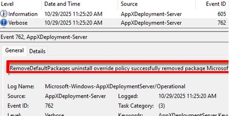 The successful removal of built-in apps can be confirmed by Event ID 762 in the Event Viewer log (Microsoft > Windows > AppX Deployment Server > Operational).