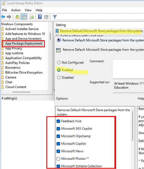 - Enable the policy Remove Default Microsoft Store packages from the system