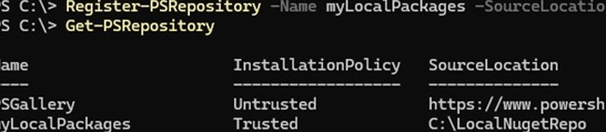 Register-PSRepository -Name myLocalPackages -SourceLocation C:\LocalNugetRepo -InstallationPolicy Trusted