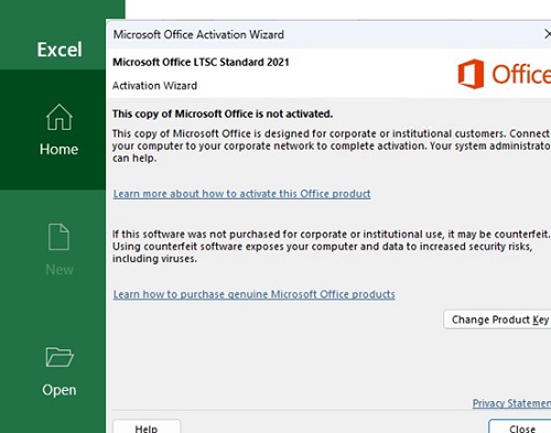 After the evaluation period expires in LTSC Office 2024 and 2021, launching any application displays a notificationThis copy of Microsoft Office is not activated, prompting the user to enter the product key and activate it.