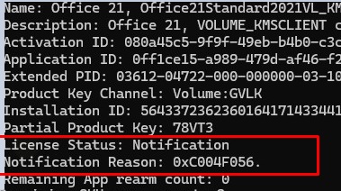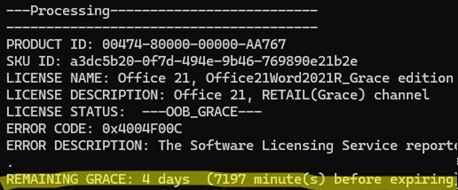 LICENSE NAME: Office 21, Office21ProPlus2021R_Grace edition LICENSE DESCRIPTION: Office 21, RETAIL(Grace) channel LICENSE STATUS: ---OOB_GRACE--- ERROR CODE: 0x4004F00C ERROR DESCRIPTION: The Software Licensing Service reported that the application is running within the valid grace period. REMAINING GRACE: 4 days (6499 minutes before expiring)