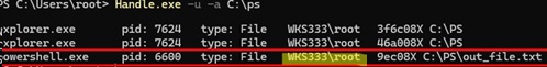 option shows the name of the user who ran the process):Handle.exe -u -a C:\Some\Path