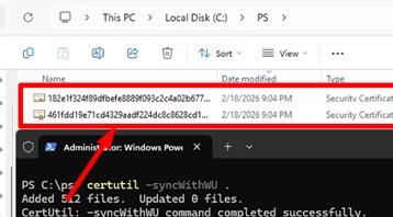 Now, when accessing a site or launching an application with an unknown certificate, Windows verifies its chain of trust by retrieving CTL lists from the specified local folder via RootDirURL and automatically installs the corresponding root certificate into the trusted store