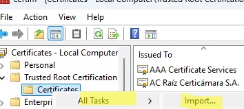 Then expand the +Trusted root certifaction authory folder, select certificates, right click all task -> import, choose the SST file create before, press the browse button and chose the Trusted root certification authority from the list. Finish.