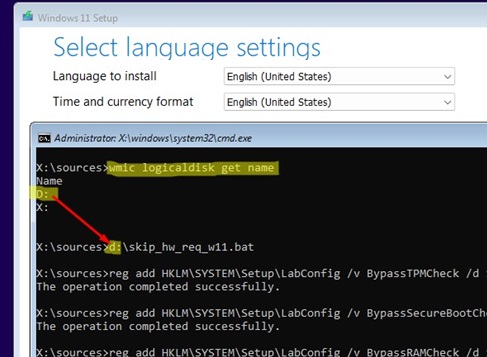 D:\skip_hw_req_w11.bat(in this case, the USB stick was assigned the drive letterD:) - This action adds registry parameters that instruct the Windows 11 installer to bypass hardware compatibility checks.