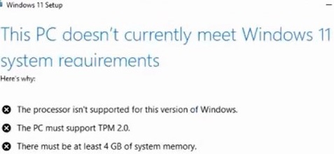 The processor isn't supported for this version of WindowsThe PC must support TPM 2.0There must be at least 4 Gb of system memory
